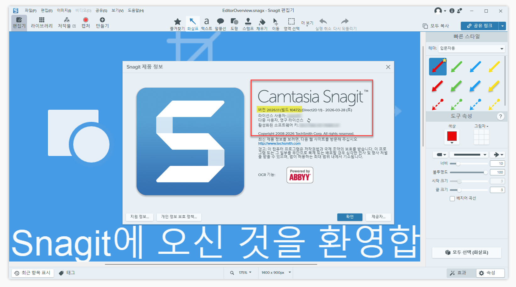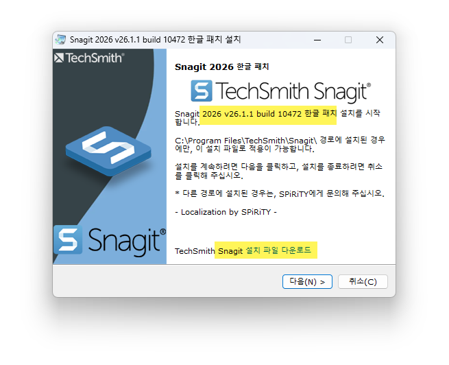 TechSmith Snagit 2026 v26.1.1 build 10472 한글 패치입니다.