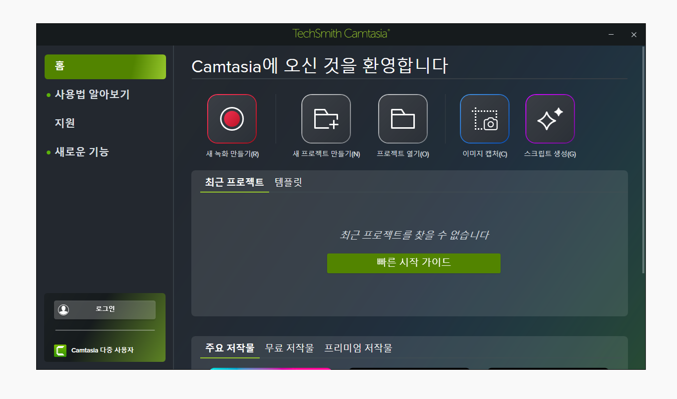 Camtasia 원본 프로그램을 실행하여 새 프로젝트 만들기까지 실행하셔야 라이브러리 압축 파일이 해제됩니다.